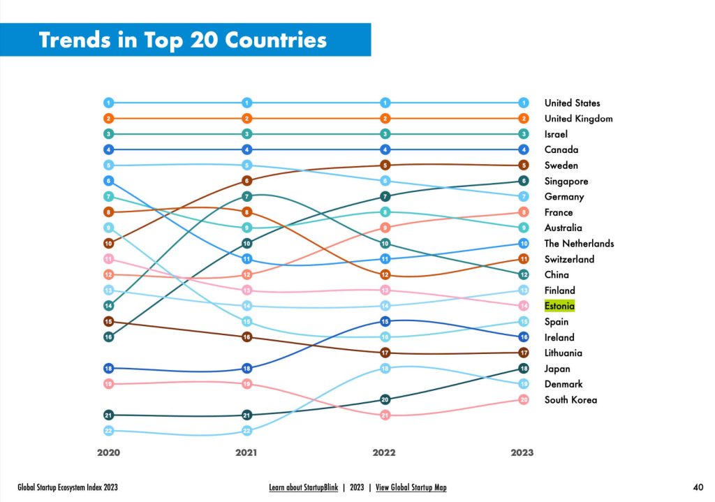 According to the Startup Blink’s Global Startup Ecosystem Index 2023 report, Estonia’s startup ecosystem is among the top globally, ranking in 14th place overall, and 6th in the EU. Not bad for a compact country of only 1.3 million people! And within Europe, Estonia ranks 8th regionally out of 410 startup economies in the global top 1000 cities.